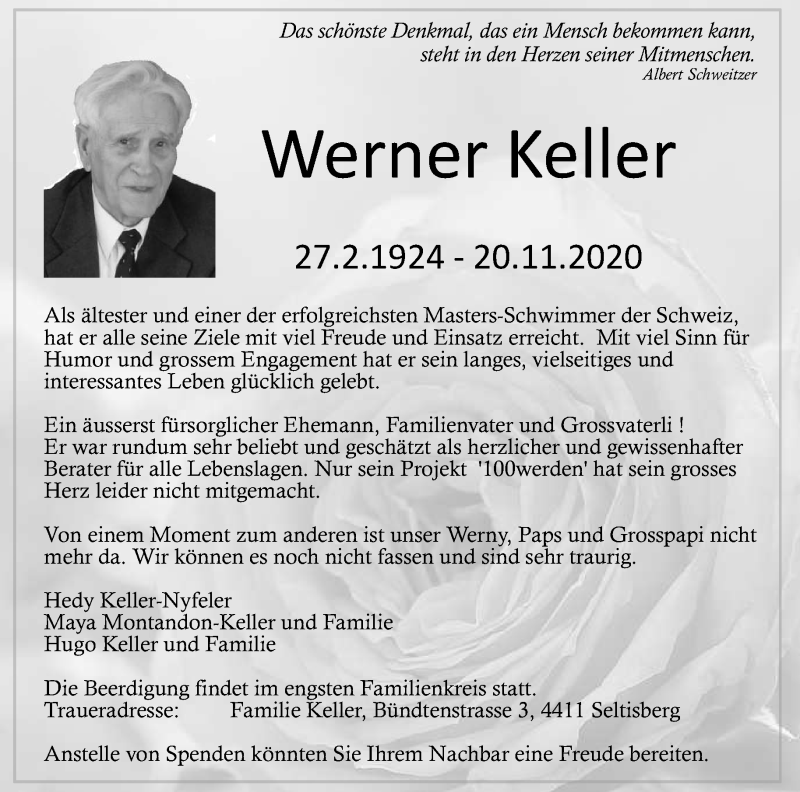 Der Schwimmverein beider Basel trauert um sein ältestes aktives Mitglied und Ehrenmitglied Werner Keller. Werni verstarb plötzlich und unerwartet am 20. November 2020 im Alter von 96 Jahren.
