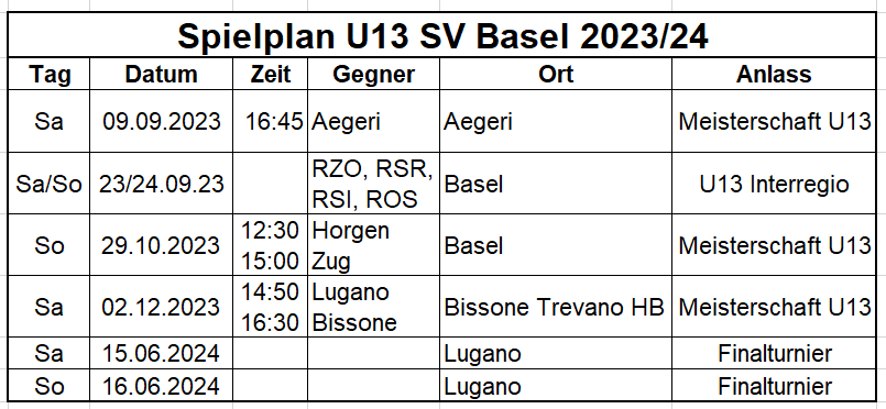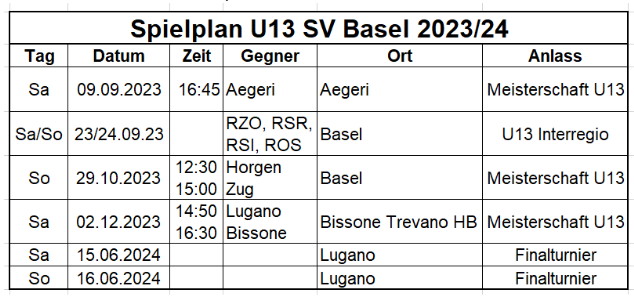 Hier noch die alle bis jetzt bekannten Daten für das U13 Team
