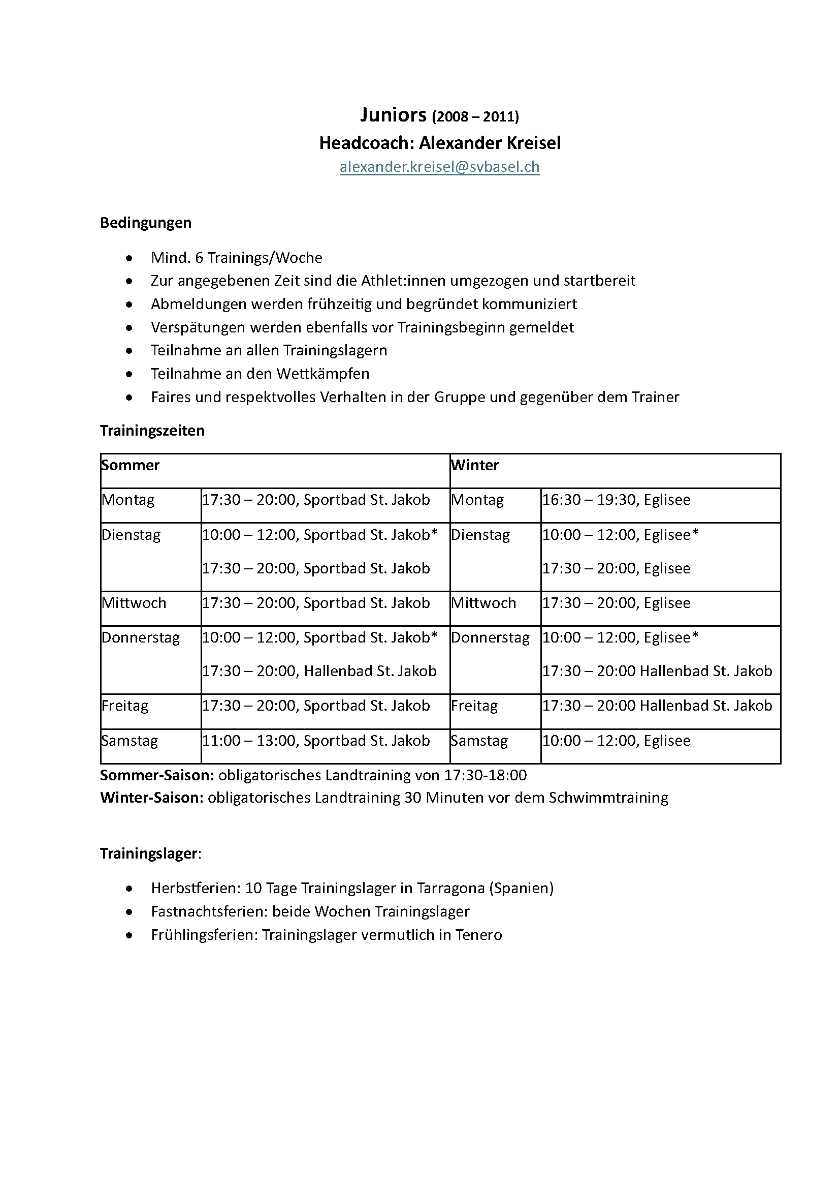 Teams und Trainingszeiten
