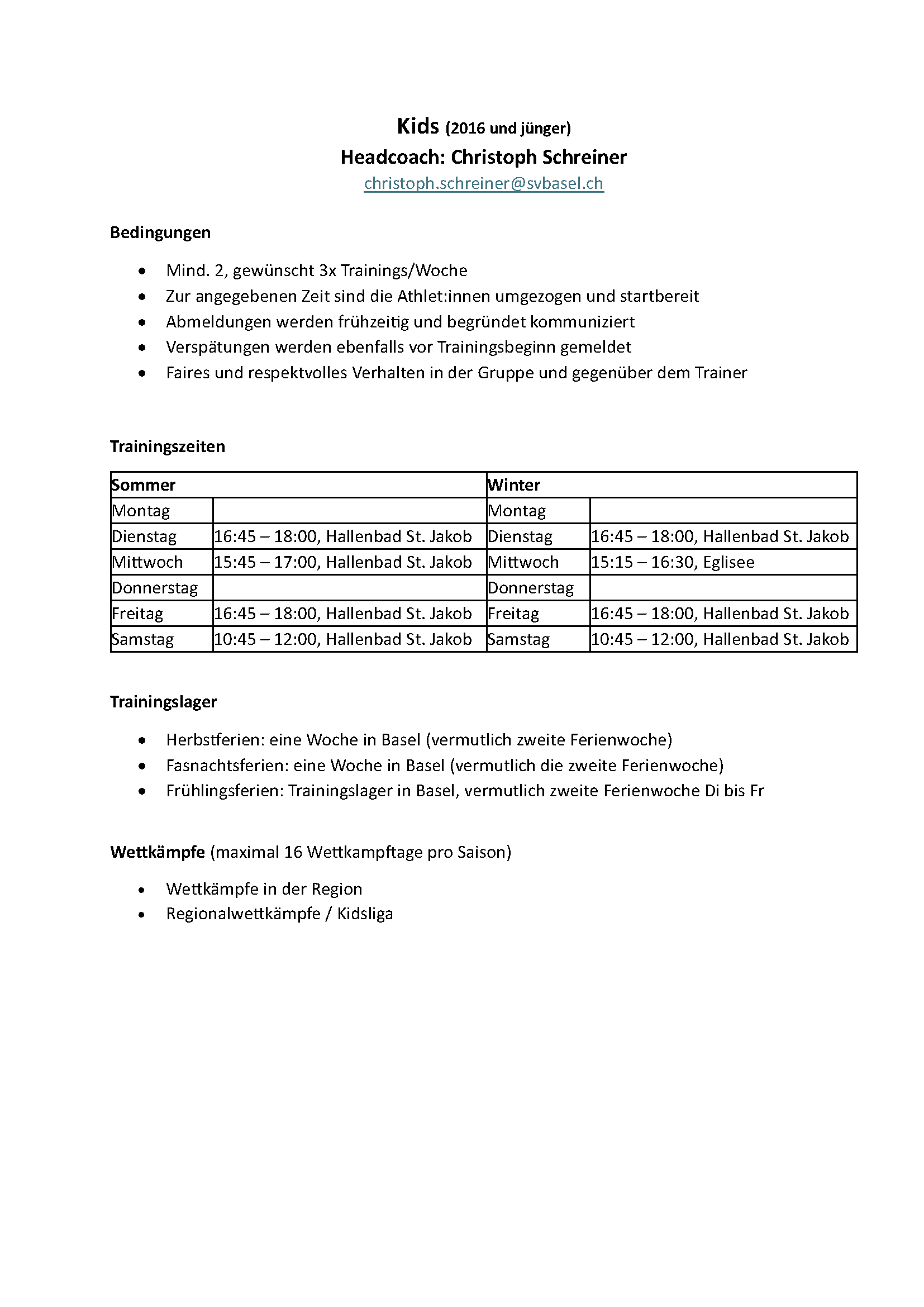 Teams und Trainingszeiten